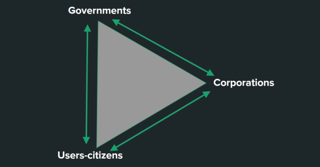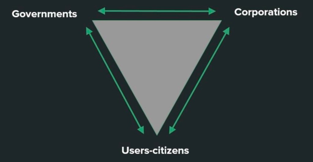 In the previous section, that illustrated the relationship between governments and users-citizens, users-citizens were already part of the equation. However, in terms of the corporations-users-citizens relationship, the latter seem to have less problems with corporate data capture than government surveillance. As already mentioned here, data has become a ‘natural’ currency to pay for Internet platforms, not in the least because these platforms are ‘free’ to use and have to be paid for somehow.