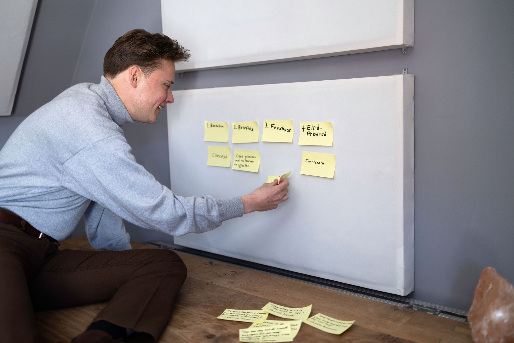 Grondig. We starten met een sessie van een ochtend met een clubje van max 6. De vormgever, hoofd marketing, en het liefst ook iemand op C-level (CEO, directeur) is hierbij. Ik stel vragen en geef jullie schrijfopdrachten. Op basis hiervan werk ik een eerste versie in 3 richtingen uit.