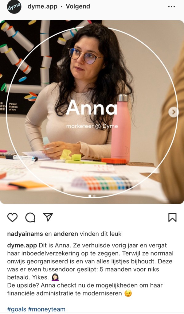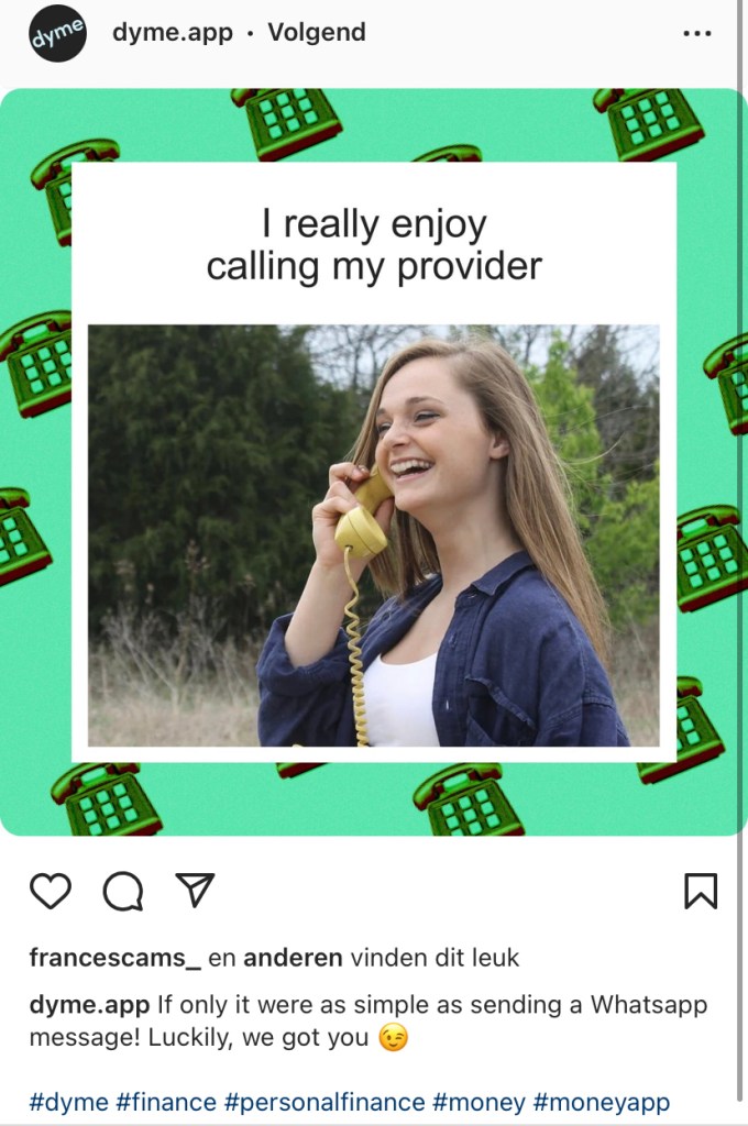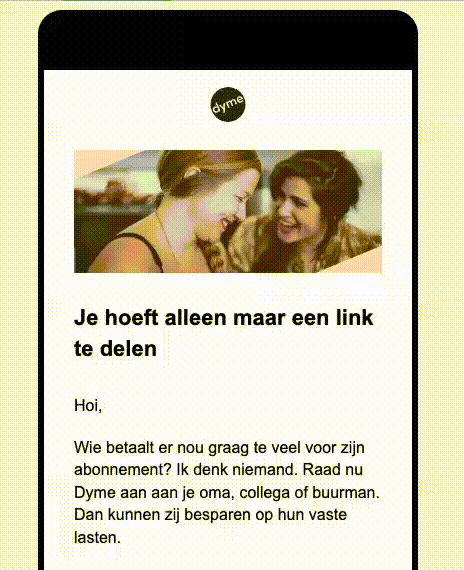 Dyme is een start-up met een duidelijke missie. Jou meer controle geven over je geld. Met de app heb je een super overzicht over je uitgaven en vaste lasten. En kun je met één klik abonnementen opzeggen. Maar dat is nog niet alles, want Dyme kan ook je vaste lasten en abonnementsprijzen voor je verlagen. Bij Dyme ben ik bijna een jaar lang de vaste in-house copywriter geweest. Ik schreef e-mails, blog posts, social posts, betalingsherinneringen en Pitch Decks en scherpte de tone-of-voice aan.