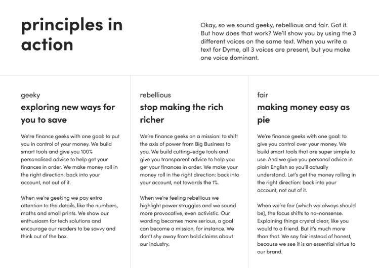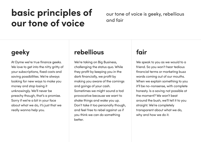 Ik breidde de tone-of-voice van Dyme flink uit met stemmen zodat het veel duidelijker wordt hoe Dyme moet klinken.