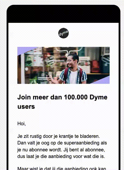 Ik schreef bij Dyme een stuk of 25 e-mailseries. Dit ging om series van tussen de 3 en 5 mailtjes met een specifiek doel. Om een app user een besparing aan te laten vragen bijvoorbeeld. Automatische mails die aanvoelen alsof een vriend of vriendin ze geschreven heeft. Zo versterk je je merk en komt een omzetstijging vanzelf.