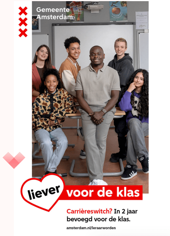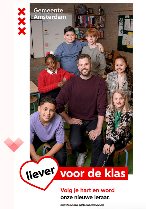 Samen met thonik bedacht ik 6 zinnen voor een postercampagne van de Gemeente Amsterdam om nieuwe leraren te werven. We richtten ons op zij-instromers (campagne Liever voor de klas) en leerlingen die nog moeten starten aan hun carrière (campagne Leraar voor 1 dag).