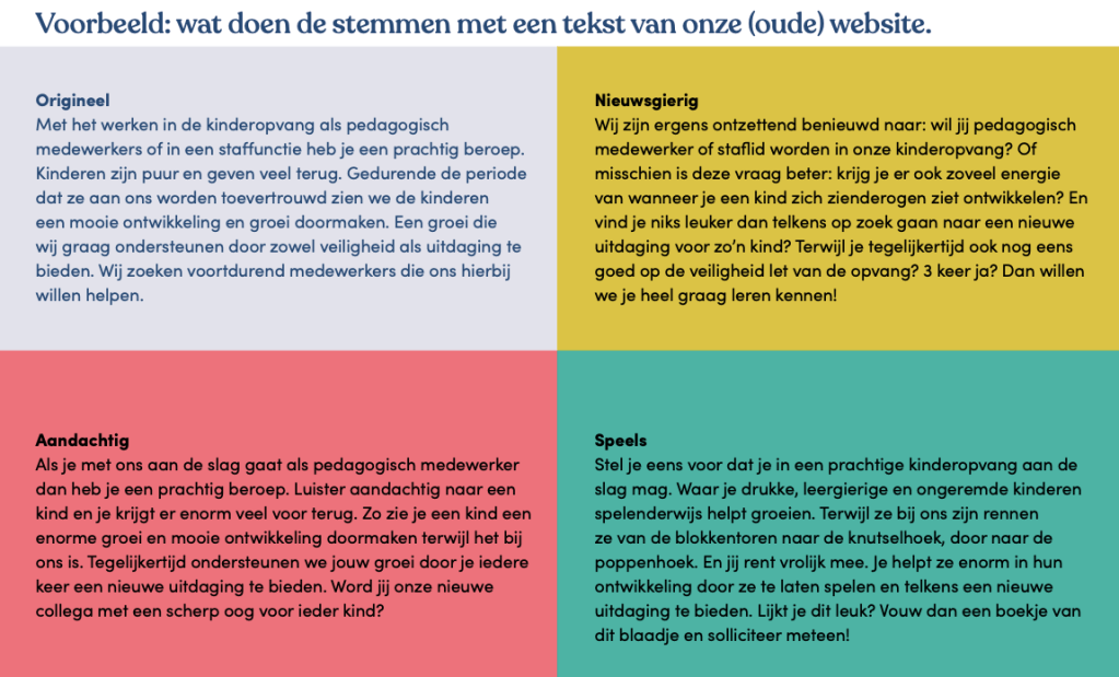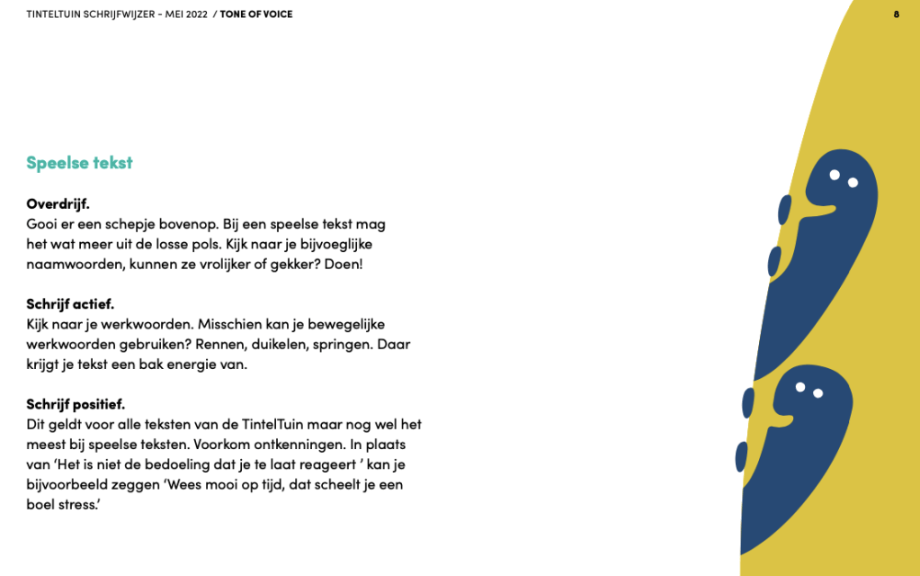 TintelTuin is een kinderopvang in Amsterdam met meer dan 90 locaties. In 2022 deden ze een rebranding traject en ik werkte met wijstudio samen aan de nieuwe schrijfwijzer en tone-of-voice. TintelTuin heeft nu een hyper persoonlijke schrijfstijl met een setje stemmen: de aandachtige, de nieuwsgierige en de speelse stem. Hierdoor kunnen ze de wereld aan op het gebied van tekst.