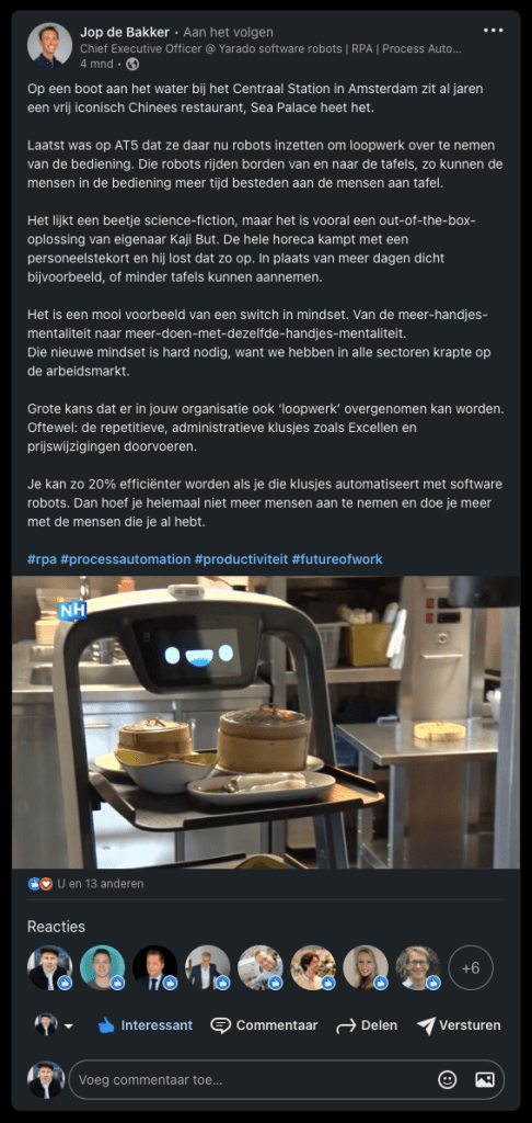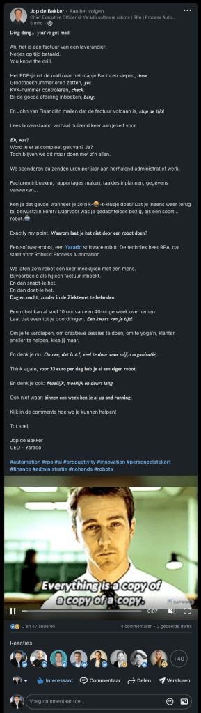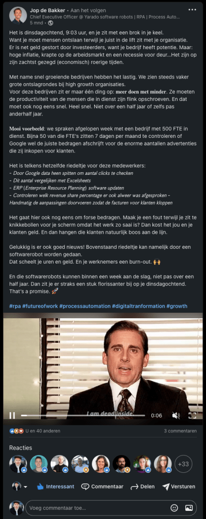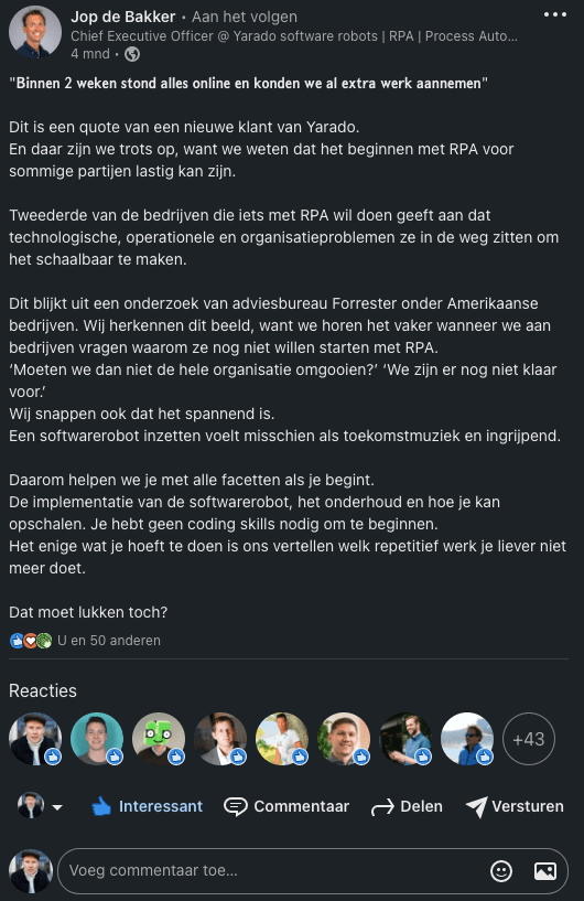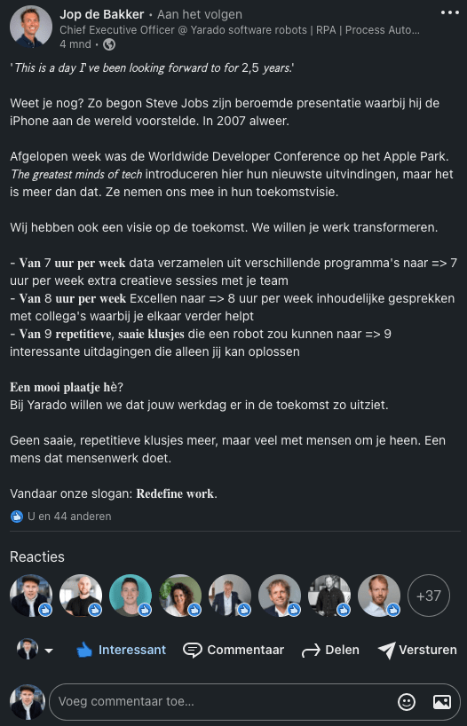 Talent is schaarser dan ooit. Yarado’s doel is om te herdefiniëren hoe jij naar werk kijkt. Dit doen ze door softwarerobots te bouwen, en bedrijven repetitief werk uit handen te nemen. Zo kunnen mensen zich richten op waar ze goed in zijn. Ik schreef voor Yarado 5 Customer Stories en 8 LinkedIn-posts.